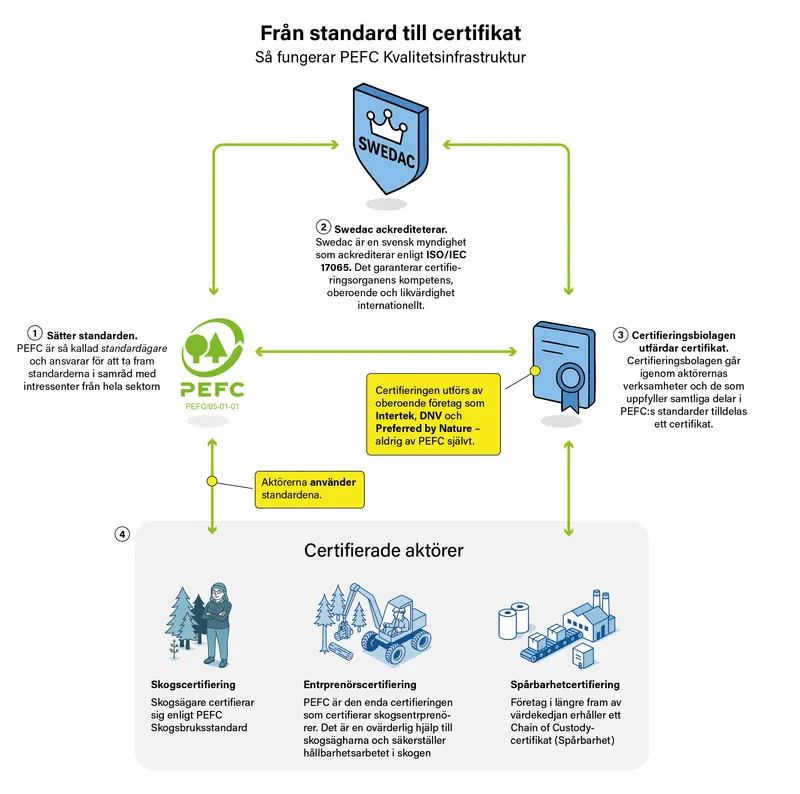 Svenska PEFC sätter standarden, Swedac ackrediterar certifieringsbolagen och de ackrediterade bolagen certifierar skogsägare, entreprenörer och företag – ett kretslopp av tillit och kontroll.